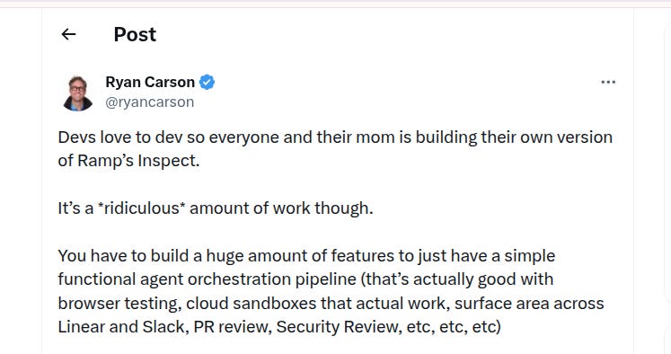 I think most teams should go for a fully managed service. Devin has been in the space for a long time. I think Twill is a relative newcomer that also does something like this? But there aren’t a ton of other services that actually follow the Ramp-Inspect / Stripe-Minions model. So when we ran into this problem ourselves, we weren’t happy with most of the other options out there and set out to build our own, which we now sell as an off the shelf option with a lot of customization flexibility (if you’re a ~Series A to ~Series D exec with a lot of AI FOMO, and you’re thinking about building your own background agents, reach out).