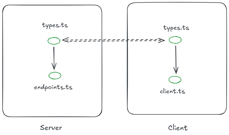 You have some endpoints file that lives on a server and some client for that server. The client and the endpoint share the same types. But the types themselves are duplicated. There is no direct connection between the types that are imported by the server endpoints file and the types that are imported by the client handlers. Most of the time, the types are kept in sync by hand — the developer is responsible for making sure that the two files align. This is an invariant, something that is true (or must be true) about the program for it to work, but is not inherently enforced by the program itself.