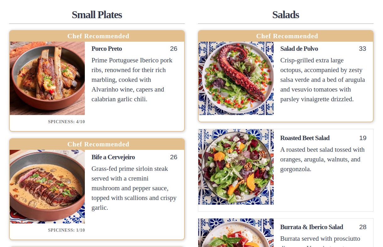 This was my first time having Piri Piri chicken, and after having heard a lot about it from a few friends familiar with the popular chain, Nando’s2, I was excited to try it. Though definitely delicious, eating a whole half chicken cooked in piri piri sauce felt overwhelming. The thing that I chase when dining out, a continuous experience of perfect bites with unexpected yet undeniably tasty flavors, felt missing. The dish was purely one thing: piri piri chicken.3 To be fair, we could’ve ordered sides if we wanted more variety, but the portion sizes were rather large. With just one app and one entree, we were already full.