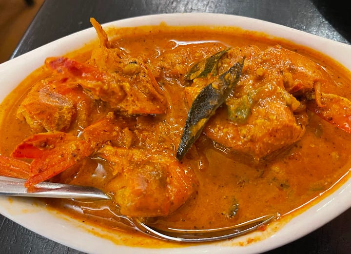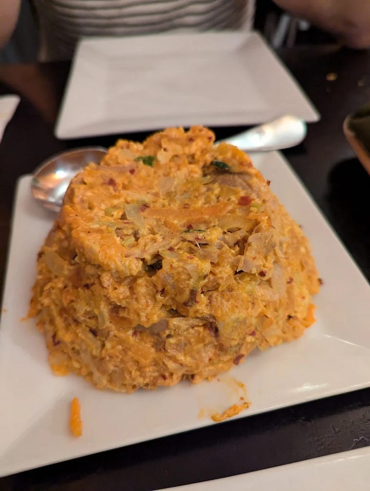 A 10min scan of the menu and many pings to our Sri Lankan friends later,3 we finally aligned on what to order. Sadly, there were only two of us, so despite wanting to try the full menu, we had room for only three or four dishes this visit. We ended up choosing the chicken lamprais, kottu roti with chicken and cheese, and the prawn curry. The chicken lamprais was deliciousâfull of spice, sweetened by caramelized onions, and deepened by the tangy flavor of the goraka. You could tell the rice had been soaked in the chicken juices and that the banana leaf cover had done a great job at keeping all those in. The kottu roti was a bit of a missâbut that may have been my fault for ordering the one with chicken and cheese. The cheese reminded me of the type youâd find in a can (Cheese Whiz?) and covered the whole dish. This was the only dish we did not wipe clean.4