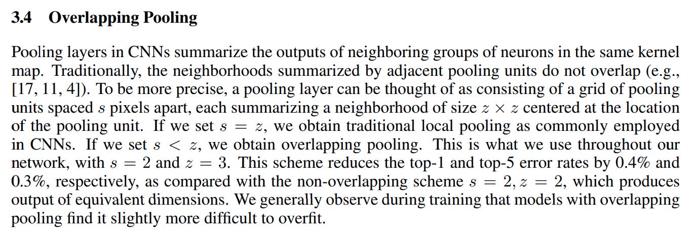 I think what’s cool about this paper is that you see early hints of the scaling hypothesis debate that would later make Ilya famous at OpenAI. The core thesis that the authors of this paper have is that they need a really big model to learn the image dataset. But in order to get a really big model, they have to do all these hacks to get the thing training in a reasonable amount of time on a reasonable hardware setup. As a result, there’s a ton of focus on speed (relu as an activation functions, gpu kernels — including what is I think the first ever GPU implementation of a convolutional layer?, multi-gpu training). And, again, there’s a focus on test quality over theoretical reasoning — for example, they basically justify using overlapping pooling through empirical analysis alone.