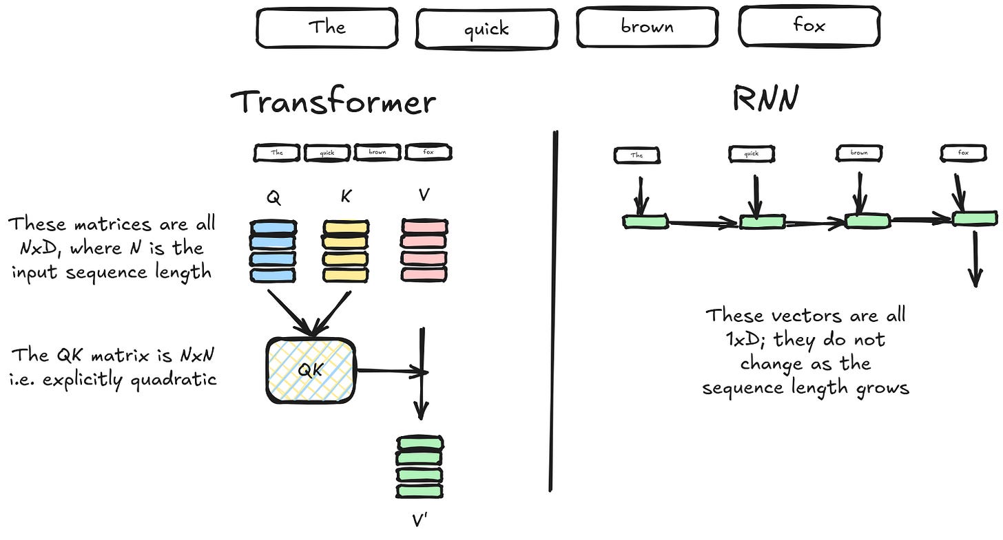 Even though transformers as an architecture have proven to be incredibly powerful general learners, they scale quadratically in compute and space as the sequence length of an input gets longer. And this is actually a general problem with attention — you have to store an increasingly large number of previous states to attend over all of them. Framed in terms of 'memory slots', you can think of the standard transformer as having a different memory slot per element in the sequence. That means the transformer 'memory' grows as the sequence length gets longer. Having a larger memory space for longer contexts is good, in that the transformer appropriately has more representation capacity when it needs it. But it also makes transformers extremely inefficient, especially compared to RNNs which scale linearly as a function of sequence length.