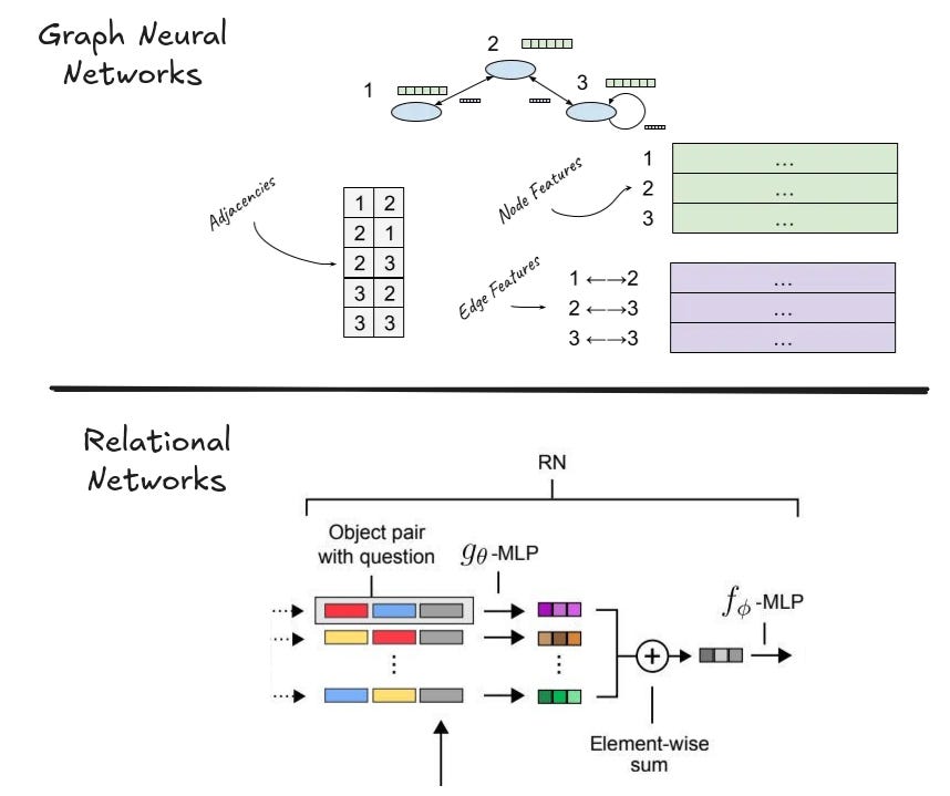 Of course, researchers did try to create architectures that would be biased towards learning relationships. We actually covered two papers in the space already. The first was the MPNN paper which attempted to learn representations over hard-coded graph relationships. And the second was the relational network paper, which used pairwise interactions between multiple object representations to do relational reasoning.
