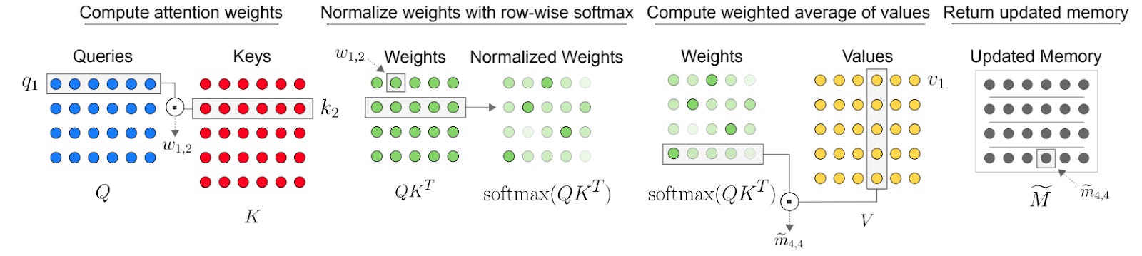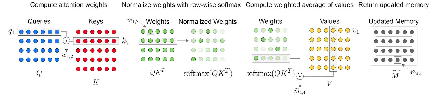 The 'memories interacting' part is pretty straightforward. Conveniently and obviously, the memory representations are just vectors, and as a result all of the slots together can be instantiated as a matrix. And a natural way to model pairwise interactions between rows in a matrix is through self attention.2 In the standard LLM setting, each token 'attends to' all of the other tokens and pulls in relevant information from those other tokens into its own representation. The authors cntrl-f the word "token", replace it with the word "memory", give some justification about why these embeddings are interchangeable3, and essentially call it a day.