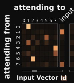 Attention analysis on the Nth Farthest task reveals some neat things about where the model 'focuses' depending on when it gets certain information. In particular, the model learns different attention patterns based on when the reference vector m is introduced. If the reference value is not present yet, the model essentially 'stores' the input into one or two memory slots.