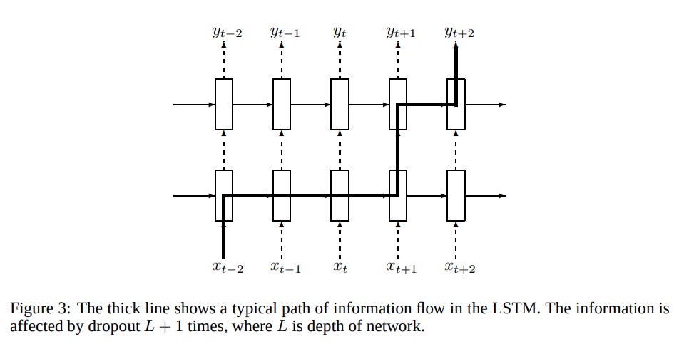 >This paper discovered that applying dropout everywhere except the hidden state dependency worked really well.