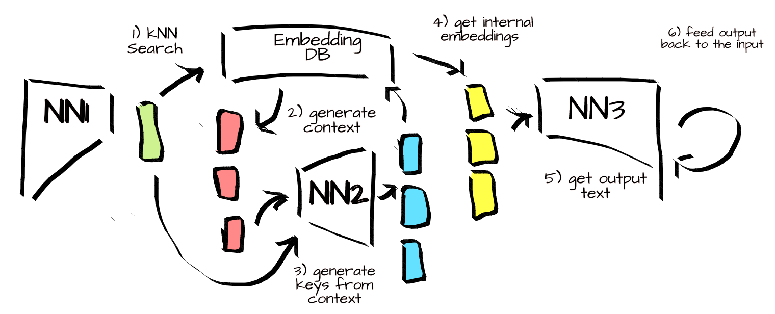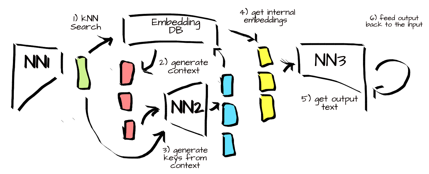 The second NN is a transformer model which produces a variable sequence of embeddings that in turn act as keys to the embedding database. The second NN ingests the output of the first NN, as well as a kNN query of the embedding database. This allows the second NN to learn how to 'attend' based on previous information, thereby refining it's ability to pull up other relevant data.