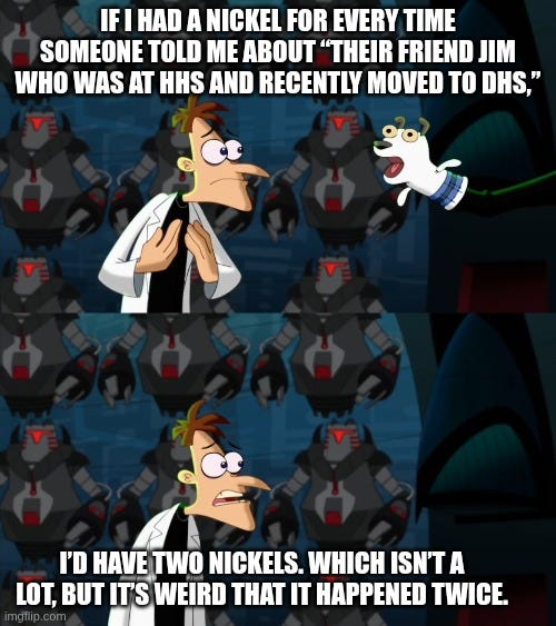 If I had a nickel for every time someone told me about “their friend Jim who was at HHS and recently moved to DHS,” I’d have two nickels. Which isn’t a lot, but it’s weird that it happened twice.