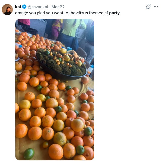 When Mia and I were in SF we got invited to a fruit themed party. Specifically, citrus. Everyone had to wear citrus clothes, you’d be turned away by a bouncer if you weren’t. There were oranges everywhere. Apparently the big theme was that you had to find a kumquat that was hidden somewhere in the house? Very unclear what you would win if you got the kumquat. I think just respect.