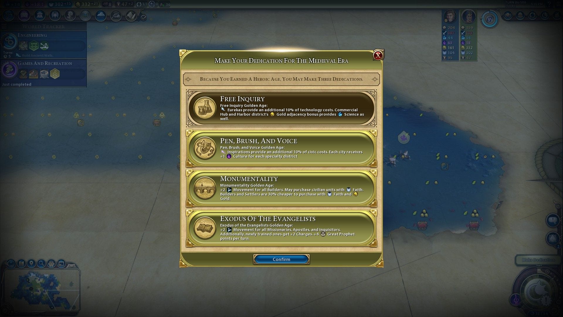 The second reason is because the first three eras let you grab the Monumentality (spend faith on civilian units) or Exodus of the Evangelists (+4 Great Prophet Points per turn, +2 spread religion charges for missionaries) Golden Age rewards. If you have any amount of faith generation, the former option can give you "free" settlers and builders, which are incredibly helpful in the early game to start your ramping engine. And in the ancient era, the latter can be the delta that lets you get a religion and lets you quickly spread it to other civs that are potentially on the other side of the map.