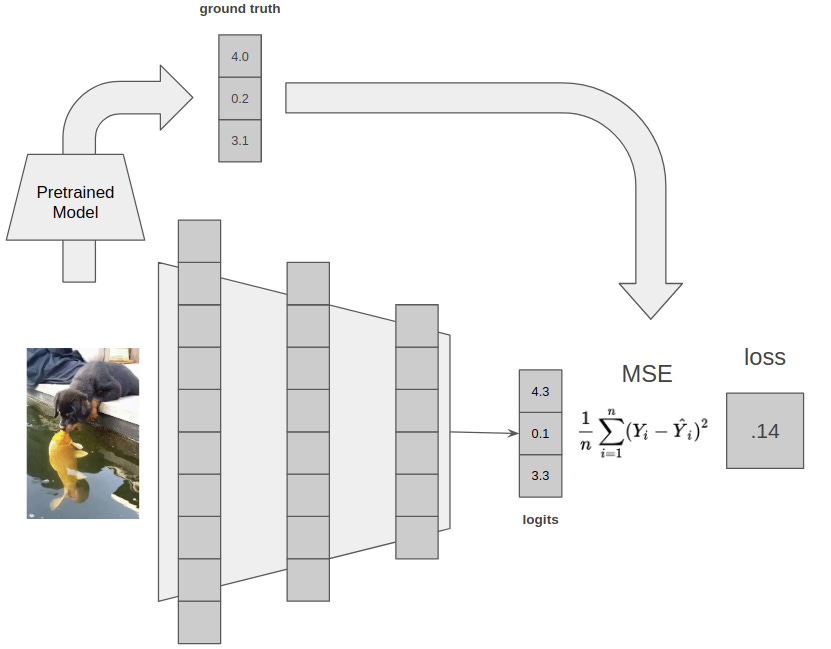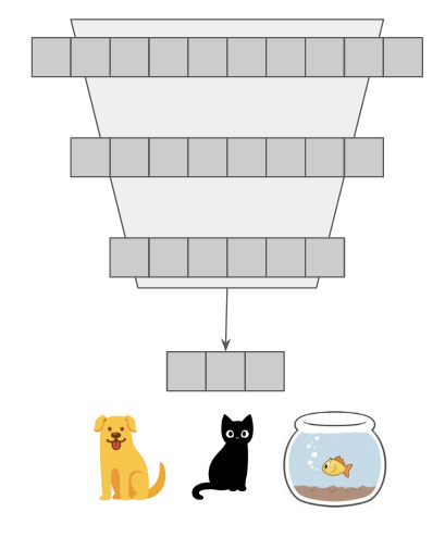 Going back to our pet example, we want the model to produce a prediction for three categories. And, these three categories are totally unrelated from each other, except that they are mutually exclusive. How do we actually represent abstract concepts in a model? Well, a model only has one building block -- the embedding. Remember, a model is just a stack of embeddings. So we basically have to enforce an external constraint on the last embedding of a model, and call that the output. This gives us a lot of flexibility -- we can say that the model outputs a vector of size three (or an embedding layer of size three), and as long as we are consistent we can arbitrarily assign each spot in the vector to an animal. So, spot 0 is 'dog', spot 1 is 'cat', spot 2 is 'fish'. If the model puts a really high value in spot 0, it's predicting dog.