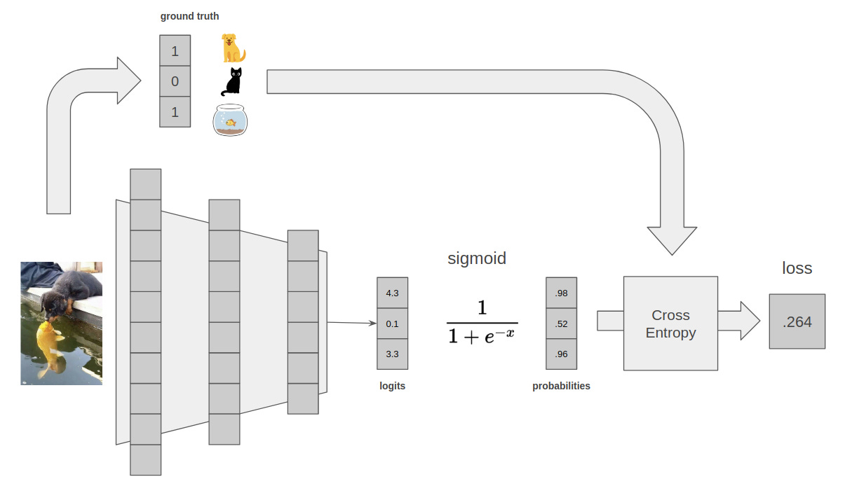 This setup is also really common! So, as you might expect, every stats package also has a function called sigmoid cross entropy, that calculates the loss above.