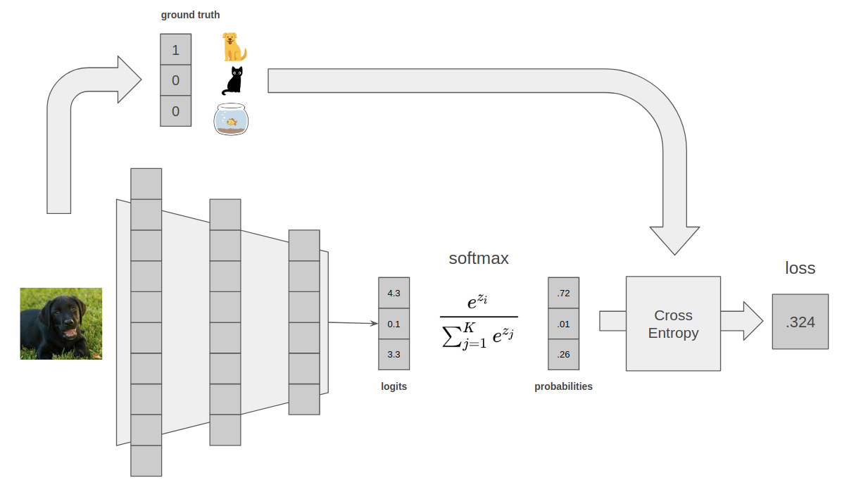 A softmax also gives us a pretty natural way to represent our ground truth. We can compare the model's outputs against a 'perfect' output. So, if we input a picture of a cat, we expect the model to output something like [0, 1, 0]. Or if we put in a picture of a dog, we want the model to output [1, 0, 0].