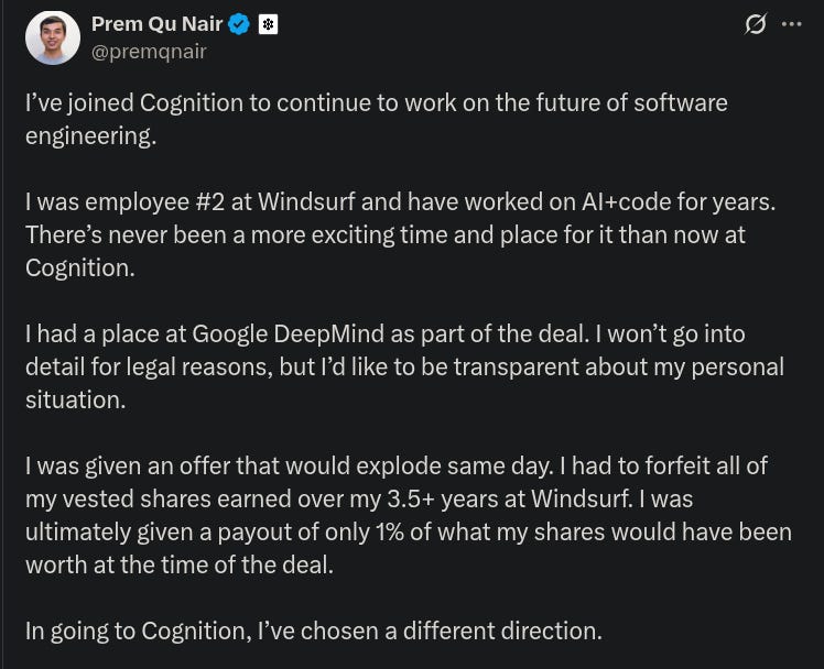 Then it gets weirder. My sources say that this deal was filled with all sorts of legal drama on both sides, and everyone is now under a super tight NDA. The big sticking point seems to be that anyone who joined Google from Windsurf lost all of their vested Windsurf stock, and instead got brand new Google stock grants, with a vesting schedule reset over 4 years. Prem had been at Windsurf for 3.5 years, so he was probably about fully vested. If he joined Google, he'd supposedly lose it all, and would have to "re-earn" the same stock over the next 4 years, with no guarantee that he would not be laid off in the middle.