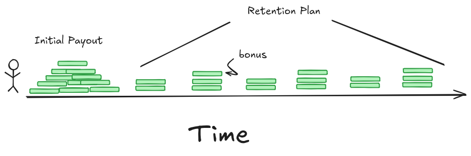 Retention plans are really variable. Generally, the acquiring company wants founders and key members of the startup to stick around. One way to have you stick around is by paying you a lot of money. Another way is to hold back the money/stock that you would have gotten for your shares, and pay out over some number of months/years instead of all at the beginning. The usual outcome is somewhere in between these extremes — the acquirer will hold back some amount of the value of the initial shares and pay that out over a 2-4 year period, and will also add some value on top so that it's not just a blatant delaying tactic. And if you get laid off, you immediately get the retained payout.1 2