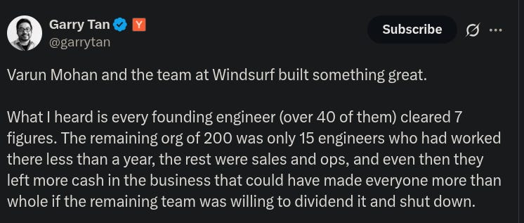 At least the Windsurf investors got paid! This suuuuuuuuuuucks for the Windsurf employees who got left behind.4 Maybe Windsurf could have survived on its own, but come on. It's hard to build a company when you've been decapitated.