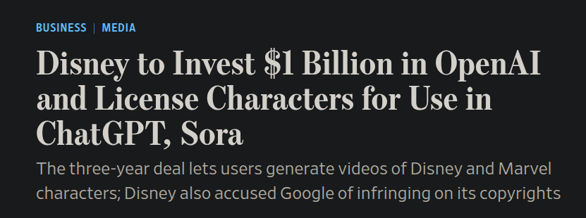 Anyway, this past week OpenAI announced that Disney was investing $1b in OpenAI. In exchange, OpenAI is getting the right to generate Disney characters. If you think of an investment as something broadly favorable to the person getting the investment, this set up makes no sense. Disney should be getting something for its investment! Why is OpenAI getting the money and the rights?
