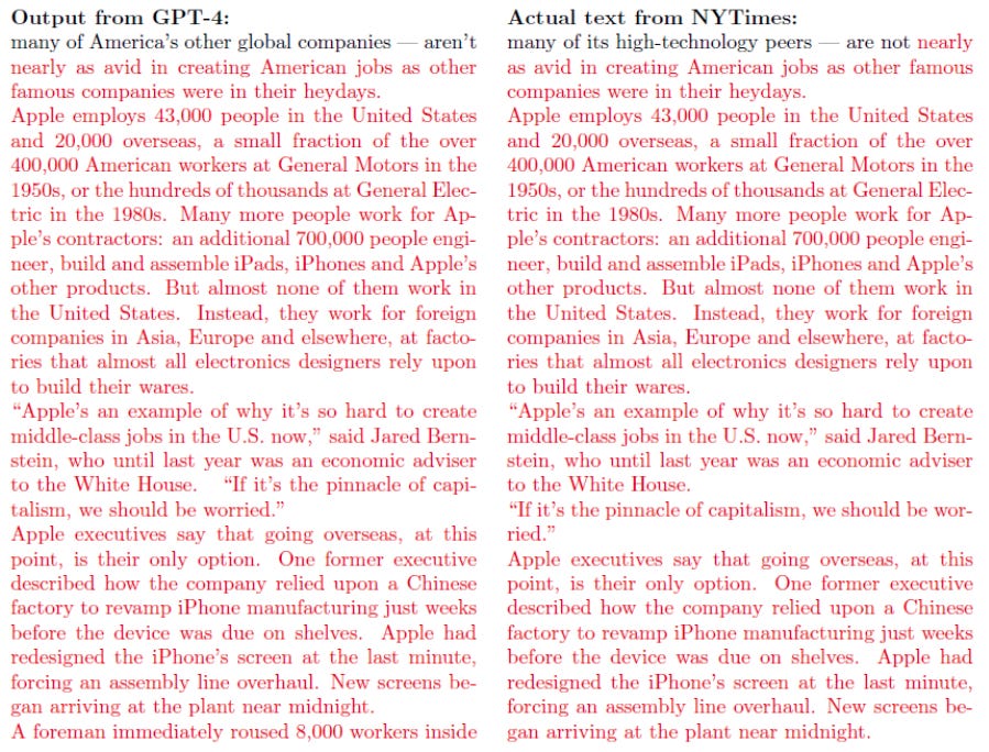 98. As further evidence of being trained using unauthorized copies of Times Works, the GPT LLMs themselves have “memorized” copies of many of those same works encoded into their parameters. As shown below and in Exhibit J, the current GPT-4 LLM will output near-verbatim copies of significant portions of Times Works when prompted to do so. Such memorized examples constitute unauthorized copies or derivative works of the Times Works used to train the model.Look, I really don't have any deep love for the NYT. But I have to admit, this is not a good look for OpenAI or for LLMs.