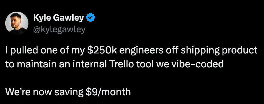 More broadly, every line of code is a liability, and there is always going to be demand for “you deal with this so I don’t have to.” A lot of SaaS is internal tooling that anyone could build but they don’t want to because it’s annoying. That stuff may be easier to simply vibe code, because it’s not directly in the critical production line that customers end up seeing. But SaaS that makes my life better — that reduces my liability to my customers or the government or whatever — isn’t going anywhere.