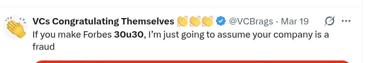 30u30: The funniest thing to come out of the Delve saga is the realization that both Delve founders are Forbes 30 under 30 recipients. When I was growing up, 30u30 was a really impressive badge of honor. But the last ~10 years have not been kind to Forbes. 30u30 is a social club that now includes infamous luminaries like Sam Bankman-Fried (FTX) and Elizabeth Holmes (Theranos); Claude found fourteen prior examples of 30u30 winners who had then either been indicted or gone to jail for fraud. There aren’t that many 30u30 founders! The base rate of fraud has to be way higher than if you were to just random sample the population. At this point, the meme is that the 30u30 nominations are pay-for-play,1 that the only people who get the award are those who aggressively game the system, and that having 30u30 on a resume is a massive red flag possibly even signaling poor character. At least one friend of mine was offered a 30u30 spot and declined the award for that reason. Now there are two more data points.