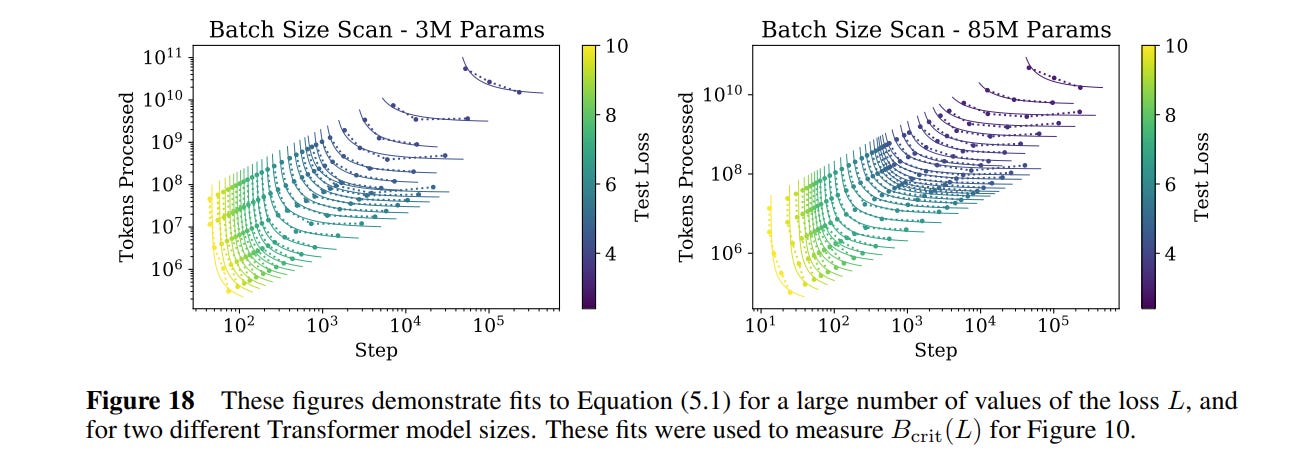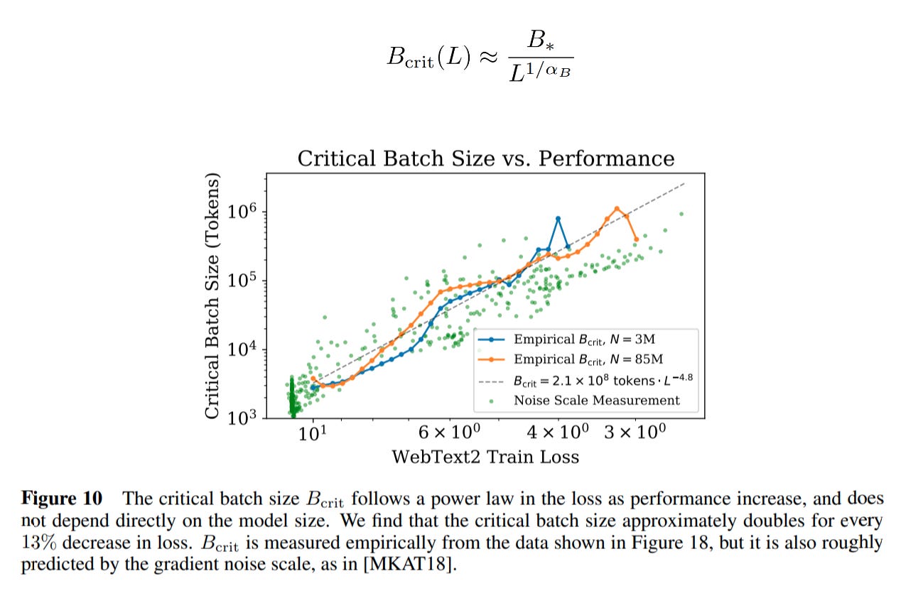 Empirically, the critical batch size is not related to the size of the neural network being trained! This is surprising — intuitively you would expect that a larger model would have more ‘capacity’ to handle more data points at a time. But in fact, that is not the case: gradients apply to the entire model, so large and small models are impacted equally by batch size.