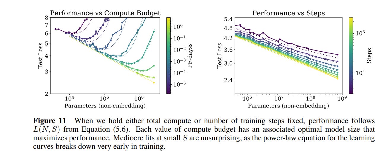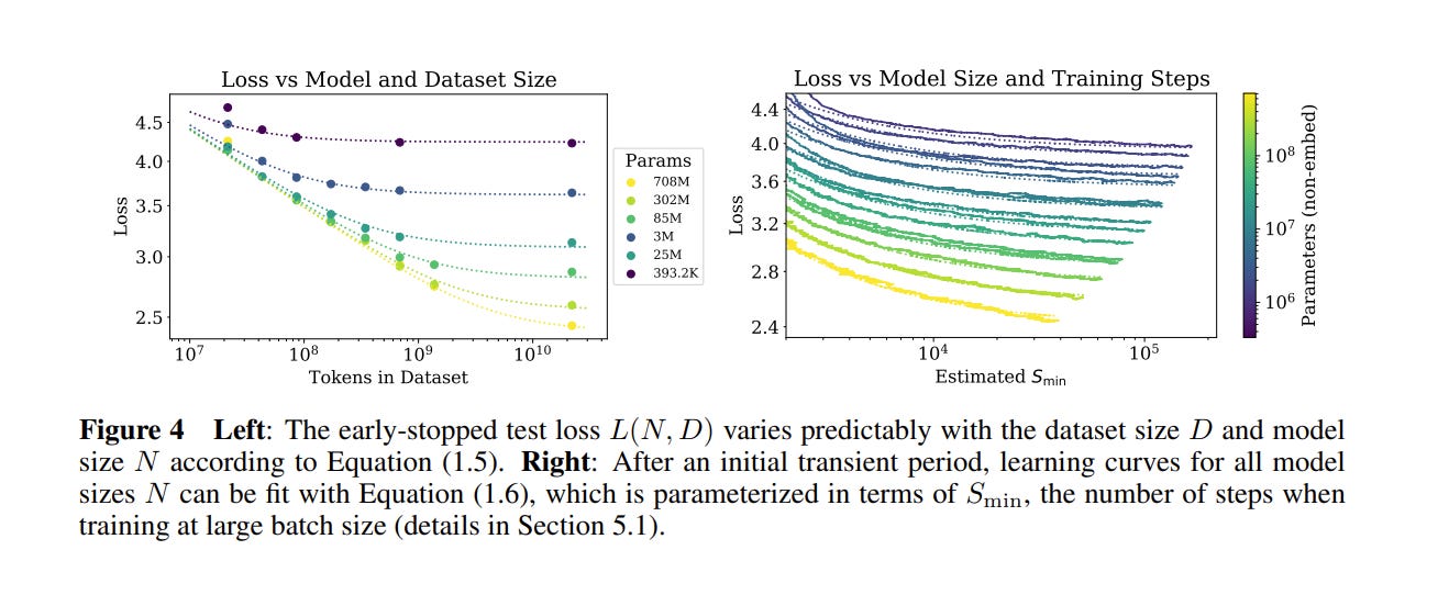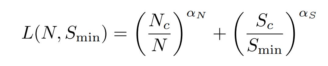 With infinite training data and infinite training time, loss scales as a power law dependent on model size. And with a sufficiently large model and infinite data, loss scales as a power law dependent on training steps. The authors propose that you can additively combine these to get a loss equation that is dependent on both model size and training time: