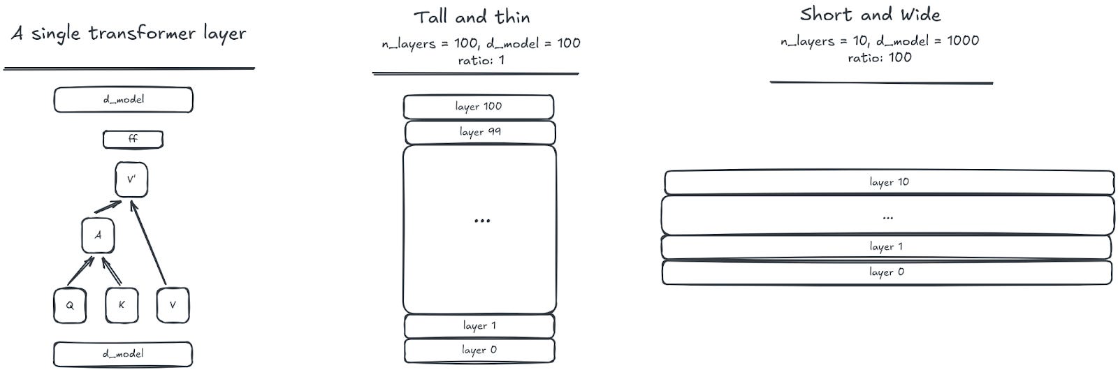 In each case, the authors change the ratios of various model hyper parameters a lot. To pick a specific example, they change the ratio of the model residual stream and the number of layers from 1 to 1000. And the delta in the performance (as measured by the test loss) is, at most, only a few percent. This is really weird! Here are two different model shapes: