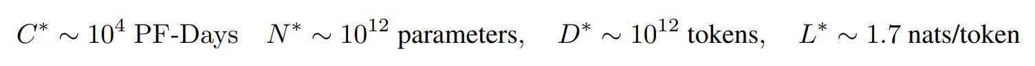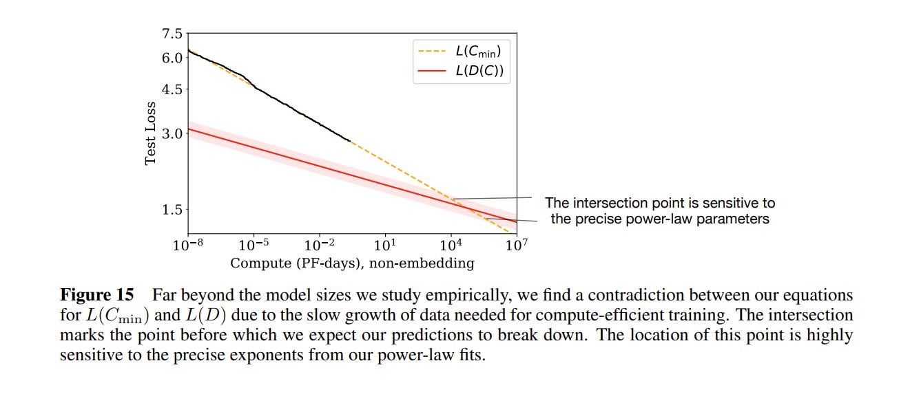 At 104 petaflop days of compute, the performance predicted by the compute trend line drops below the bound defined by the data trend line. So somewhere before 104 peta-flop days of compute, these scaling laws have to break down.
