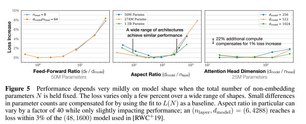 What’s especially interesting is that shape seems to not really matter for a wide range of model sizes. The number of parameters seems to be the primary driver for how well a model does; any particular configuration is only going to move the needle a few percent at most. For anyone who has ever done painful hyperparameter grid searches, this is perhaps a breath of fresh air. You do not really have to worry about whether your particular research innovation is being sabotaged by bad hyperparameters; and there is less reason to feel compelled to do just one more iteration of tuning to try and get better results. But assuming these results hold for architecture outside of transformers, it also means that vast amounts of literature related to micro-optimizations are probably not worth the paper they were printed on.