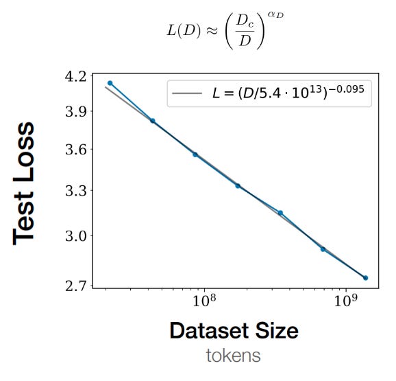 The strongest justification for their equation is that it seems to map pretty well to the data. Note especially that the larger the dataset size, the more accurate the loss prediction. With this equation in hand, we can be pretty confident about what the optimal test loss will be for a given model before we’ve done any training at all.6