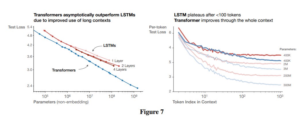 Here our intuition serves us better. Transformers seem to linearly improve with size while LSTMs eventually taper off, in large part due to their difficulty in handling longer sequences. Note that this is accounting for parameter size, so we can’t just round it off as transformers having more compute per token. There is something about transformers that make them pound for pound better than LSTMs.